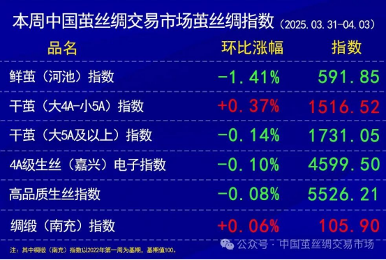干繭價(jià)格指數(shù)上,本周成交較少。春繭上市在即,現(xiàn)貨報(bào)價(jià)有所還價(jià)空間。大5A以上干繭的價(jià)格指數(shù)略收跌,大4A及5A干繭的價(jià)格指數(shù)略收漲。