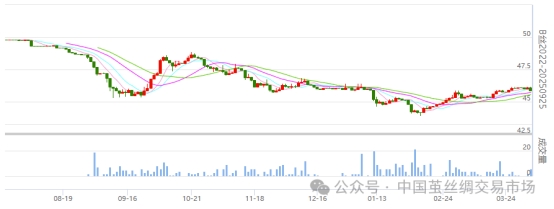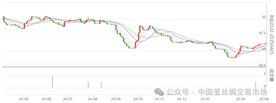 今日(2025年04月03日,周四)中國繭絲綢交易市場(chǎng)生絲電子指數(shù)下跌0.19%報(bào)收于4599.50點(diǎn),本周生絲指數(shù)累計(jì)下跌0.10%。B絲2022D(商檢4A級(jí)生絲):250425合約下跌0.12萬元報(bào)收于46.05萬元;250925合約下跌0.24萬元報(bào)收于45.87萬元;260325合約下跌0.12萬元報(bào)收于45.75萬元。