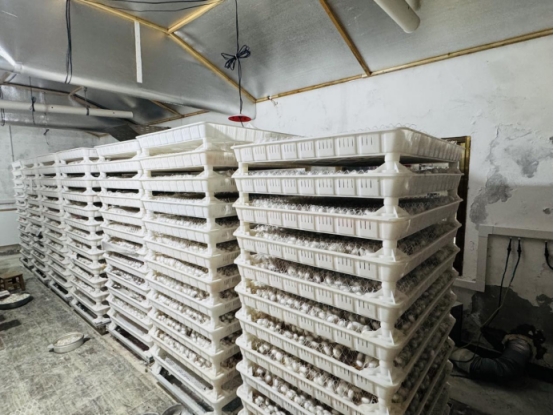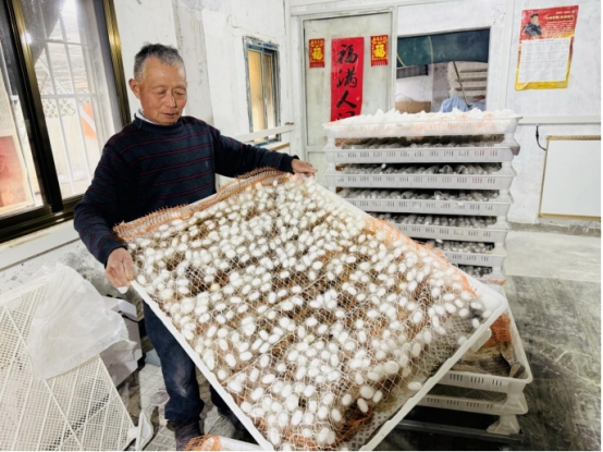 隨著工業(yè)化進程的加快以及農村勞動力的逐漸老化,蠶桑產(chǎn)業(yè)轉型升級勢在必行,家蠶人工飼料培育與傳統(tǒng)家蠶飼養(yǎng)相比,具有省工、省時、省力且一年四季均可飼養(yǎng)的優(yōu)勢,很好地解決了人工、季節(jié)對傳統(tǒng)養(yǎng)蠶方式的制約問題。作為鑫緣集團2025年的首批工廠化飼料蠶農村飼養(yǎng)試點,吳冠群在村黨總支大力支持和鑫緣集團技術指導下,飼料蠶從一張紙、兩張紙飼養(yǎng)起慢慢積累經(jīng)驗,至今已成功飼養(yǎng)了第四批,今年春節(jié)的一張紙創(chuàng)下了最好產(chǎn)量每張達58公斤。