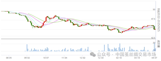 今日(2025年04月08日,周二)中國繭絲綢交易市場生絲電子指數(shù)下跌0.52%報收于4553.53點。B絲2022D(商檢4A級生絲):250425合約下跌0.36萬元報收于45.54萬元;250925合約上漲0.15萬元報收于45.15萬元;260325合約下跌0.03萬元報收于45.48萬元。