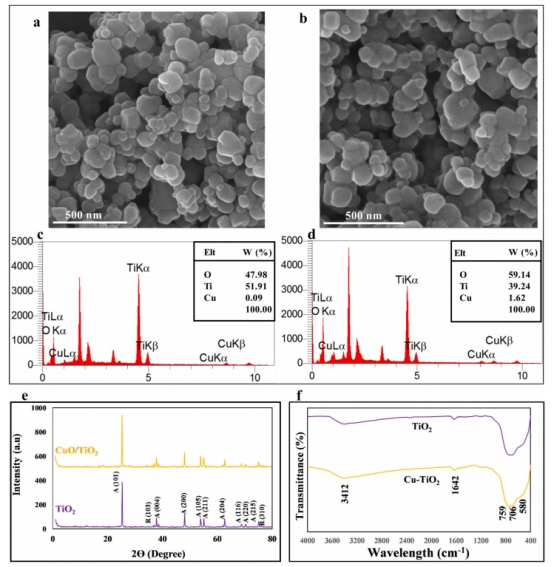 絲素蛋白納米顆粒(SFNPs)不僅穩(wěn)定性高、無毒,還能實(shí)現(xiàn)藥物的可控釋放。阿霉素 “搭乘” SFNPs 這趟 “列車”,被精準(zhǔn)輸送到腫瘤組織。經(jīng)檢測,制備的 DOXSFNPs 粒徑為257±6nm,zeta電位為 -14.3±1.8mV,載藥率高達(dá) 12.38±1.73%。此外,TNPs和CTNPs的EDAX結(jié)果表明,在二氧化鈦結(jié)構(gòu)中加入氧化銅后,Cu重量百分比增加到1.62 %,表明CT納米顆粒的合成成功。XRD 表明合成的TiO?以銳鈦礦相為主并含少量金紅石相,CTNPs 出現(xiàn)與CuO衍射峰 ;FTIR 分析了其化學(xué)組成但CuO在特定區(qū)域特征峰不明顯;用 DCFH - DA 檢測發(fā)現(xiàn) CTNPs 產(chǎn)生的 ROS 顯著多于 TNPs,因其能增強(qiáng)電子 - 空穴對分離等提升 ROS 產(chǎn)量,后續(xù)將基于 CTNPs 研究聲動力療法對水凝膠抗腫瘤特性的影響。(圖1)