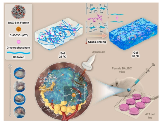 該研究旨在開發(fā)一種基于多糖的具有適當(dāng)物理和化學(xué)性質(zhì)的生物活性水凝膠,用于在乳腺癌治療中結(jié)合化療和 SDT。特別研究了負(fù)載 DOX 的 SF - NPs(DOXSF/CS)的 CS 水凝膠對化療藥物的控釋潛力。因此,該研究首先將 DOX 負(fù)載到 SFNPs 中,然后將 DOX - SFNPs 和 CuO - TiO?納米顆粒(CTNPs)分散在 CS 水凝膠基質(zhì)(CT - DOXSF/CS)中,以制備具有合適生物學(xué)和機(jī)械性能的所需水凝膠。對制備的水凝膠的化學(xué)結(jié)構(gòu)、溶脹率、降解率、機(jī)械和流變學(xué)性能以及細(xì)胞相容性進(jìn)行了全面研究。該研究在體外和體內(nèi)評估了這些水凝膠的抗癌效果。(Scheme 1)