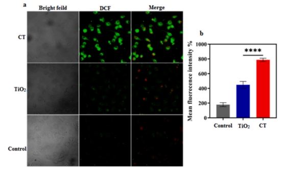為探究 TNPs 和 CTNPs 產(chǎn)生 ROS 的水平差異及其在癌癥治療中的應(yīng)用,利用 DCFH-DA 作為探針檢測 MCF-7 細(xì)胞系中的 ROS 水平,通過 CLSM 和 ELISA 對產(chǎn)生的熒光進(jìn)行定量分析,結(jié)果顯示 CTNPs 產(chǎn)生的 ROS 顯著多于 TNPs。這是因?yàn)樵赥iO2中引入 CuO 后能產(chǎn)生新電子態(tài),增強(qiáng)電子-空穴對分離,同時 CuO 作為助催化劑可促進(jìn)電子轉(zhuǎn)移、防止復(fù)合,其催化特性還能加強(qiáng)與氧和水分子的作用,并且銅參與的類芬頓反應(yīng)也有助于產(chǎn)生更多 ROS?;诖耍罄m(xù)將利用 CTNPs 深入研究聲動力療法對水凝膠抗腫瘤特性的影響。(圖2)