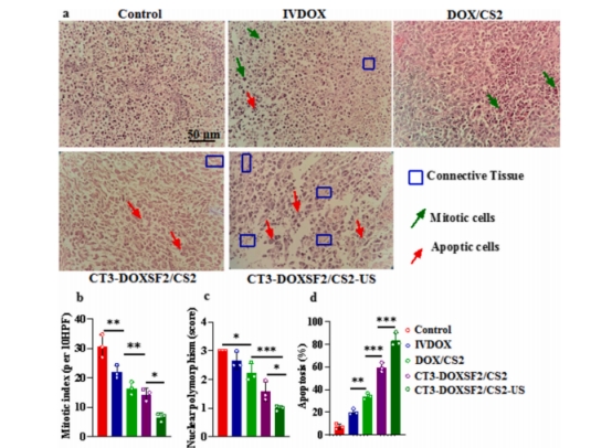 通過染色觀察腫瘤的有絲分裂指數(shù)、核多形性和細(xì)胞凋亡水平,發(fā)現(xiàn)對照組的 MI 和 NP 值最高,細(xì)胞生長分裂活躍。DOX/CS2 組凋亡面積小于其他組,但相比對照組仍有顯著差異且 MI 較低。CT3 - DOXSF2/CS2 組因 SF 持續(xù)釋藥,在注射部位周邊腫瘤區(qū)域誘導(dǎo)出更多凋亡;DOX/CS2 組因藥物被鄰近組織快速吸收,局部療效受限,凋亡面積小。CT3 - DOXSF2/CS2 - US 組凋亡水平更高,體現(xiàn)了 CT 聲動力療法與 DOX 控釋的協(xié)同促凋亡作用。經(jīng) SDT 后,CT 納米顆粒產(chǎn)生的 ROS 會損傷細(xì)胞成分、激活信號通路,促使細(xì)胞凋亡并增加對 DOX 的敏感性??傮w上,CT3-DOXSF2/CS2 和CT3-DOXSF2/CS2 - US 組在高凋亡水平下,MI 和 NP 值低于 IVDOX 組 。