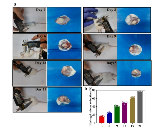 研究人員將水凝膠皮下注射到小鼠背部,用卡尺測量體積并通過手術(shù)直接觀察其在1 - 21天內(nèi)的變化,發(fā)現(xiàn)水凝膠呈透明狀且隨時間逐漸變小,這是由于 CS 聚合物釋放導(dǎo)致降解。測量水凝膠重量發(fā)現(xiàn),注射 12、15、21 天后,其重量損失分別約為 43.51%、56.76%、75.94% 。對水凝膠周圍組織進(jìn)行組織學(xué)分析,雖在注射后第 6 天出現(xiàn)急性炎癥,但從第 9 天開始炎癥明顯減輕,到第 21 天基本消失,證明該水凝膠生物相容性良好。