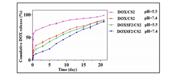 在負(fù)載方面,SFNPs 表面與疏水性氨基酸殘基的相互作用及靜電引力促使 DOX 負(fù)載,且其載藥量高(15% w/w 時,DL 達(dá) 12.38±1.73% ,EE 達(dá) 95.3±2.01%)。釋放研究中,模擬癌細(xì)胞環(huán)境,監(jiān)測 21 天發(fā)現(xiàn) DOX 在 pH 7.4 時緩慢釋放,pH 5.5 時大量釋放,如 DOX/CS2 在 pH 5.5 釋放最快,這是因?yàn)榈?pH 下 CS 中氨基質(zhì)子化致溶脹、DOX 離子化增強(qiáng)。而 pH 5.5 時 DOX 從 SFNPs 釋放增加,或因酸性環(huán)境影響 SFNPs 穩(wěn)定性及與 DOX 的相互作用。DOXSF2/CS2 釋放速率比 DOX/CS2 慢,精準(zhǔn)控制釋放速率可減少對健康組織影響,保證癌細(xì)胞對治療藥物的持續(xù)接觸 。(圖7)
