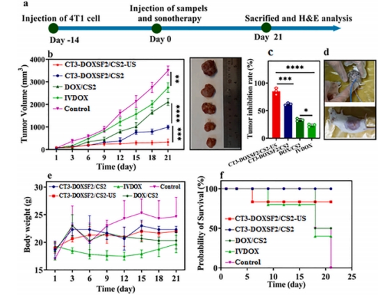 通過對患有 4T1 腫瘤的雌性 BALB/c 小鼠進(jìn)行實(shí)驗(yàn),評估了 DOX/CS2 和 CT3 - DOXSF2/CS2 的抗腫瘤效果、全身毒性及生存率情況。在抗腫瘤效果方面,對照組腫瘤生長迅速,CT3 - DOXSF2/CS2 - US 組腫瘤體積減小最明顯,超聲激活 CT 納米顆粒產(chǎn)生的 ROS 與腫瘤體積減小有關(guān),第 3 天起不同治療組間陸續(xù)出現(xiàn)顯著差異,DOX 從 DOXSFNPs 的控釋提高了療效,體現(xiàn)出局部遞送 DOX 的優(yōu)勢。全身毒性實(shí)驗(yàn)中,靜脈注射 DOX 使小鼠體重下降,而 CT3 - DOXSF2/CS2 - US 和 CT3 - DOXSF2/CS2 組體重穩(wěn)定,顯示出較低毒性。生存率上,CT3 - DOXSF2/CS2 組在 21 天內(nèi)無死亡,CT3 - DOXSF2/CS2 - US 組第 6 天出現(xiàn) 1 例死亡,靜脈注射 DOX 組平均生存率為 18 天 。