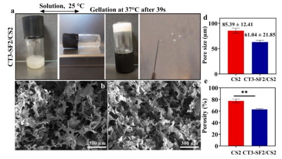 通過在 CS 中摻入 GP 得到溫度敏感型水凝膠 CT3 - SF2/CS2。這種水凝膠在 25°C 時能以溶液狀態(tài)用注射器注射,37°C 時發(fā)生凝膠化。FE - SEM 顯示 CS2 水凝膠具連通多孔微觀結(jié)構(gòu),利于水和藥物或細(xì)胞滲透負(fù)載,是藥物遞送和組織工程的潛在材料。理想抗腫瘤水凝膠需特定孔徑和孔隙率范圍,實(shí)驗(yàn)測得 CS2 和 CT3 - SF2/CS2 凍干水凝膠平均孔徑分別為 85.39±12.41μm 和 61.04±21.85μm,添加 SFNPs/CT 使孔徑減?。≒ = 0.0038);二者平均孔隙率分別約 79.25% 和 63.42%,CT3 - SF2/CS2 孔隙率降低是因 SF 與 CS 間形成氫鍵致結(jié)構(gòu)致密,因其孔隙率在可接受范圍,故適用于局部抗腫瘤應(yīng)用。(圖5)