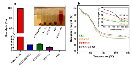 圖6 水凝膠溶血實(shí)驗(yàn)及TGA分析