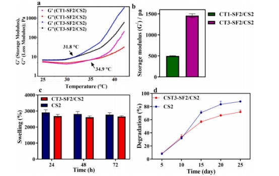 接著,本研究指出 CS 的流變學(xué)特性與凝膠化溫度受濃度、pH 及添加劑等因素影響,DOXSFNPs 和Cu - TiO?納米顆粒分別通過靜電、氫鍵、配位及范德華力等與 CS 相互作用。經(jīng)實(shí)驗(yàn)發(fā)現(xiàn),1%(w/w)的 SFNPs 濃度對凝膠化時間最佳,增加 CT 含量會降低凝膠化溫度、提升模量與交聯(lián)密度,且 CT3 - SF2/CS2 樣品粘彈性增強(qiáng),其G'/G''比值增大,材料行為趨近彈性,CT 還可能影響復(fù)合材料拉伸強(qiáng)度與模量。在溶脹率方面,37°C 的 PBS 中,CS2 和 CT3 - SF2/CS2 水凝膠 24 小時內(nèi)達(dá)最大溶脹,添加 SFNPs 和 CT 降低了溶脹百分比,但統(tǒng)計學(xué)上不顯著。降解率監(jiān)測顯示,從第 10 天起,CT3 - SF2/CS2 樣品降解速率低于 CS,這是因?yàn)?SFNPs 和 CTNPs 與 CS 的分子作用改變了水凝膠交聯(lián)密度和網(wǎng)絡(luò)結(jié)構(gòu),進(jìn)而影響降解行為。(圖4)