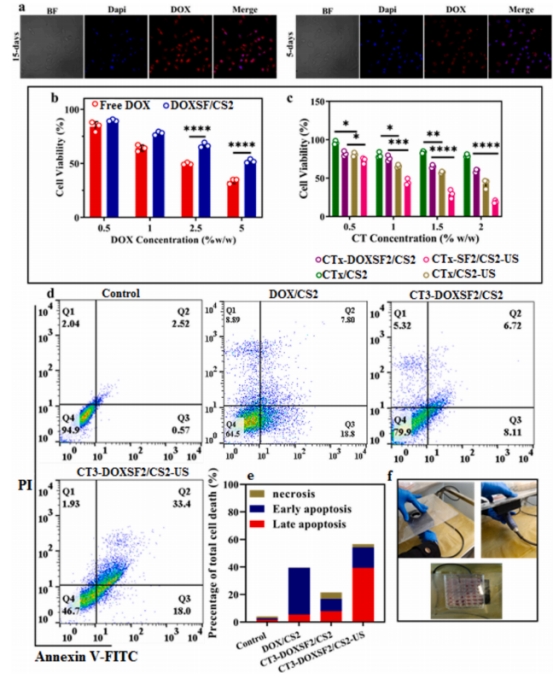 接著,通過多種實(shí)驗(yàn)研究了含 CT 和 DOX 的水凝膠對 MCF - 7 細(xì)胞的作用及機(jī)制。MTT 實(shí)驗(yàn)表明,DOXSF2/CS2 的細(xì)胞毒性低于游離 DOX,體現(xiàn)了其對 DOX 的控釋作用;CTx/CS2 對細(xì)胞無明顯毒性,CT4/CS2 - US 因超聲下 CT 產(chǎn)生 ROS 而表現(xiàn)出顯著毒性,CTx - DOXSF2/CS2 - US 的抗癌效果比 CTx - DOXSF2/CS2 更顯著,CT3 - DOXSF2/CS2 - US 的 IC50 更低,且 CT 濃度增加會加大照射與未照射配方的差異。Annexin V/PI 雙染法驗(yàn)證 MTT 結(jié)果,發(fā)現(xiàn) CT3 - DOXSF2/CS2 - US 處理的細(xì)胞凋亡率更高,CT 通過產(chǎn)生 ROS、損傷 DNA 等誘導(dǎo)凋亡,DOX/CS2 比 CT3 - DOXSF2/CS2 引發(fā)的凋亡更顯著,因?yàn)槠?DOX 釋放更快。CLSM 圖像顯示 CT3 - DOXSF2/CS2 中的 DOX 呈控釋狀態(tài)。(圖8)