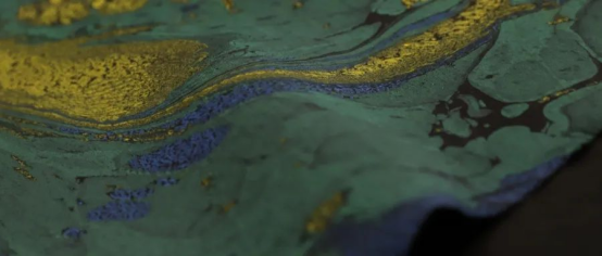 墨池香云紗的著色工藝獨特而珍惜,其著色過程依賴水的自然流動,染料在水面漂浮后附著于面料之上。每一次著色,水與染料的交融都如同一場無法復(fù)刻的即興創(chuàng)作,水流的速度、方向,染料的擴(kuò)散程度,皆存在細(xì)微差異,致使每次掛染出的顏色與圖案都獨一無二。