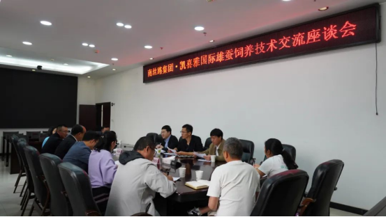 座談會上,南絲路集團(tuán)對凱喜雅國際趙樹超專家一行的到來表示熱烈歡迎,本次座談會旨在加強(qiáng)企業(yè)間技術(shù)合作,深化科研成果轉(zhuǎn)化,促進(jìn)蠶桑產(chǎn)業(yè)提質(zhì)增效。會上,雙方就“秋·華×平30”(蠶種)的遺傳特性、飼養(yǎng)優(yōu)勢、桑葉搭配等核心內(nèi)容開展全面交流。雙方一致認(rèn)為,蠶種是蠶桑產(chǎn)業(yè)鏈的源頭,加強(qiáng)優(yōu)質(zhì)蠶種的技術(shù)交流和合作推廣,對提升區(qū)域蠶桑綜合效益具有重要意義。