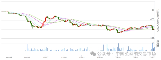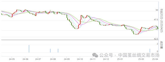今日(2025年04月09日,周三)中國繭絲綢交易市場生絲電子指數(shù)下跌0.14%報收于4547.26點。B絲2022D(商檢4A級生絲):250425合約下跌0.09萬元報收于45.45萬元;250925合約下跌0.03萬元報收于45.12萬元;260325合約下跌0.03萬元報收于45.45萬元。