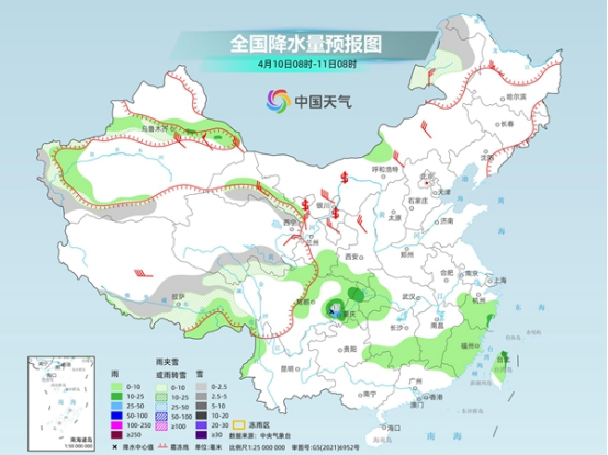 具體來看,今天,新疆沿天山地區(qū)和南疆盆地、青海南部、甘肅河西、內(nèi)蒙古東北部、西藏東部和南部、川西高原北部等地部分地區(qū)有小雪或雨夾雪。陜西南部、四川東北部、重慶、浙江中南部、湖南南部、江西中南部、福建等地部分地區(qū)有小到中雨,其中,重慶西南部局地有大雨。