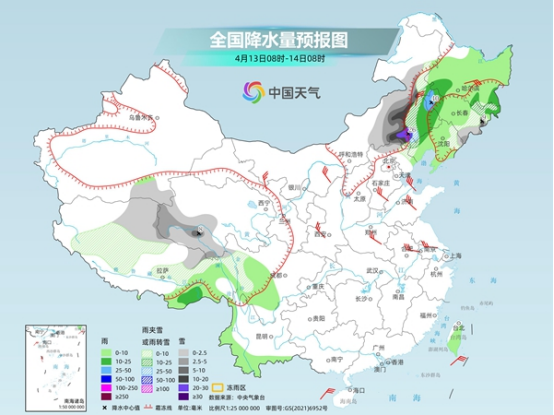 明天,內(nèi)蒙古中東部、黑龍江西北部、吉林西部、遼寧西部、河北北部、青藏高原大部等地部分地區(qū)有小到中雪或雨夾雪,其中,內(nèi)蒙古中東部、黑龍江西北部、吉林西部、遼寧東部、河北北部等地部分地區(qū)有大到暴雪,局地大暴雪,黑龍江西部局地有凍雨。東北地區(qū)中西部、西藏東南部、四川西部、云南西部和南部、江淮東部、江南大部、華南大部等地部分地區(qū)有小到中雨,其中,東北地區(qū)中西部、江南南部、華南東部等地部分地區(qū)有大雨。