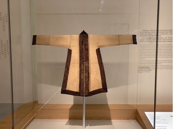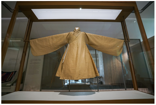 “2022年1月,南京云錦研究所承接了上海博物館的摹制任務(wù),整體項(xiàng)目周期耗時(shí)兩年?!表?xiàng)目結(jié)果得到了上海博物館及行業(yè)專家的驗(yàn)收和認(rèn)可,從中可看出千百年前絲織文物的原本樣貌,領(lǐng)略古人的工藝與審美。同期摹制的還有一件明代夾袍,也是由南京云錦研究所承接,陳列于展廳正入口處。