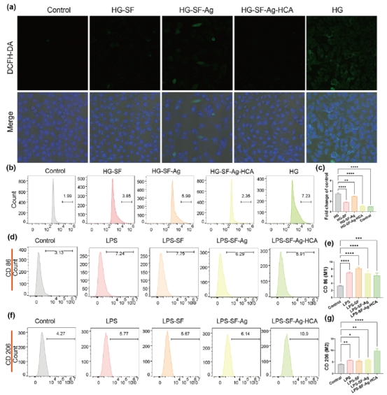 圖2g-h的電子順磁共振(EPR)表明,SF-Ag-HCA可完全清除·OH自由基。細(xì)胞實(shí)驗(yàn)(圖3a-c)進(jìn)一步驗(yàn)證:高糖環(huán)境下,SF-Ag-HCA組細(xì)胞內(nèi)ROS熒光強(qiáng)度降低80%,堪稱“細(xì)胞級清氧大師”!