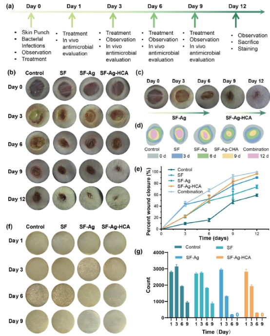 圖4a-e顯示,SF-Ag-HCA處理的小鼠感染傷口在第12天幾乎完全愈合,顯著優(yōu)于對照組和市售水凝膠(Hydrosorb)。細(xì)菌載量檢測(圖4f-g)證實(shí)其快速殺菌能力。
