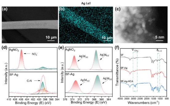 示意圖1展示SF-Ag-HCA的制備流程:蠶絲無紡布浸漬AgNO?溶液,銀離子與纖維配位形成SF-Ag;隨后通過BOP偶聯(lián)劑將HCA嫁接,賦予ROS清除能力。圖1a-c的SEM和元素映射顯示,銀離子均勻分布在蠶絲纖維表面(紅色區(qū)域),無團(tuán)聚現(xiàn)象。XPS分析(圖1d-e)證實(shí)Ag?與蠶絲化學(xué)鍵合,而非物理吸附。