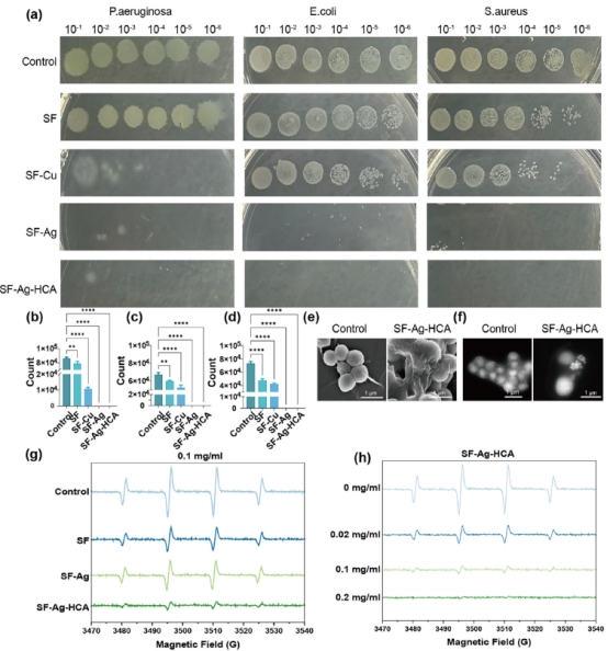 圖2a-d顯示,SF-Ag-HCA對金黃色葡萄球菌(S.aureus)、大腸桿菌(E.coli)和銅綠假單胞菌(P.aeruginosa)的抑菌率均超99%!SEM和TEM(圖2e-f)更直觀:細(xì)菌膜結(jié)構(gòu)崩解,內(nèi)容物泄漏,死得透透的。