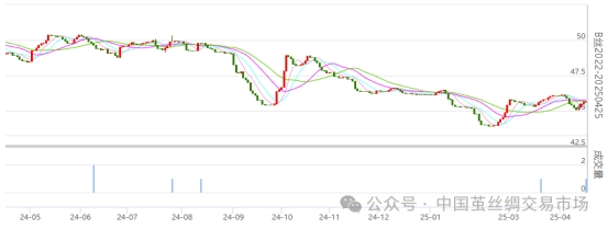 今日(2025年04月17日,周四)中國繭絲綢交易市場生絲電子指數(shù)上漲0.69%報收于4581.94點。B絲2022D(商檢4A級生絲):250425合約上漲0.06萬元報收于45.69萬元;250925合約上漲0.63萬元報收于46.17萬元;260325合約上漲0.63萬元報收于45.90萬元。