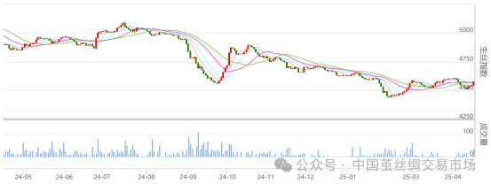 在目前春繭收購態(tài)勢的帶動下,今日生絲盤面各遠近合約普遍收紅,主力合約漲幅顯著。成交量較昨日量也出現(xiàn)顯著增長,市場活躍度顯著提升。