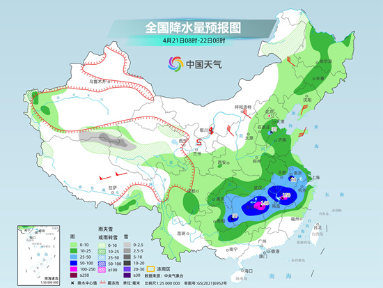 今天(4月21日),南方降雨進(jìn)入過程最強時段,局地將遭遇大暴雨,需警惕強對流天氣,同時,北方地區(qū)也將出現(xiàn)大范圍降水。受較強冷空氣影響,今明兩天長江中下游及其以北地區(qū)氣溫下降明顯并伴有大風(fēng)天氣,多地降溫如換季。