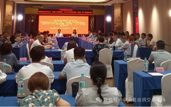 2025年廣西春繭于近日陸續(xù)上市,預(yù)計本月下旬全區(qū)春繭全面上市。為幫助企業(yè)做好今年絲綢生產(chǎn)經(jīng)營工作,降低經(jīng)營風(fēng)險,4月21日下午,廣西繭絲綢行業(yè)協(xié)會在南寧市召開協(xié)會四屆四次會員大會、四屆六次理事會暨2025年全區(qū)繭絲綢(春季)生產(chǎn)經(jīng)營座談會。相關(guān)部門領(lǐng)導(dǎo)、協(xié)會領(lǐng)導(dǎo)和部分絲綢企業(yè)負(fù)責(zé)人等70余人參加了此次會議。廣西自治區(qū)工信廳紡織醫(yī)藥處處長、自治區(qū)繭絲辦主任唐海蓉等領(lǐng)導(dǎo)出席會議并指導(dǎo)工作。