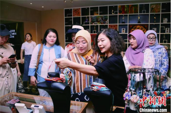 圖為范燕燕(右一)向外賓介紹絲巾藝術(shù)作品