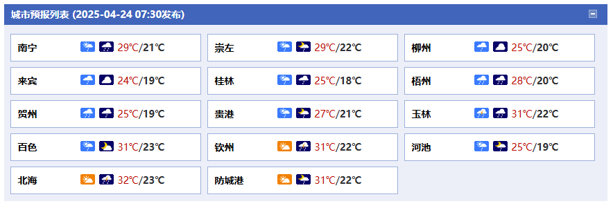 南寧市:今天白天到晚上,小到中雨、局地大雨,東北風2~3級,最高氣溫29℃,最低氣溫21℃。