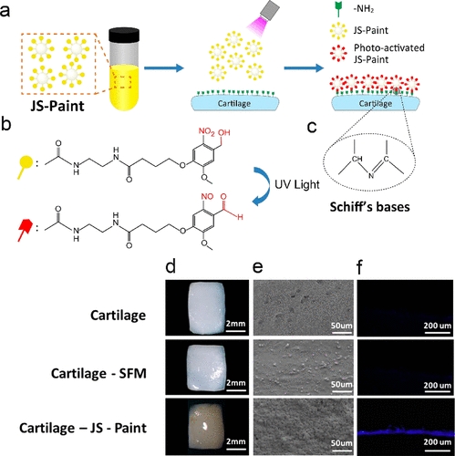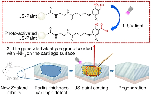 關(guān)節(jié)軟骨損傷是全世界最常見(jiàn)的關(guān)節(jié)疾病之一,然而,部分厚度軟骨缺損在臨床環(huán)境中仍然是一個(gè)挑戰(zhàn)。微??梢詾榧?xì)胞遷移和增殖提供更多空間,從而促進(jìn)細(xì)胞浸潤(rùn)和組織再生。因此,治療部分厚度缺損的理想策略和精確技術(shù)是開(kāi)發(fā)一步式、即用型粘合劑微粒,這些微??梢灾苯诱掣皆跐耜P(guān)節(jié)軟骨表面并重新填充不規(guī)則和殘缺的缺損。小分子N-(2-氨乙基)-4-[4-(羥甲基)-2-甲氧基-5-硝基苯氧基]-丁酰胺(NB)具有光觸發(fā)基團(tuán)變化的特性,可用于組織粘合劑。浙江大學(xué)歐陽(yáng)宏偉團(tuán)隊(duì)制備了一種即用型 NB 修飾絲素蛋白微粒懸浮液,以粘附在關(guān)節(jié)表面(稱為JS-Paint)。該研究以題為“Tissue-Adhesive Paint of Silk Microparticles for Articular Surface Cartilage Regeneration”的論文發(fā)表在《ACS Applied Materials & Interfaces》上。