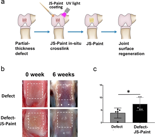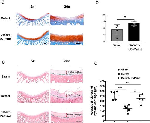 在兔子模型的髕股溝上產(chǎn)生了部分厚度缺陷。分散的缺陷區(qū)域完全涂覆JS-Paint;未處理的部分厚度缺陷用作對(duì)照組(圖6b)。手術(shù)6周后,JS-Paint處理組(Defect-JS-Paint)表面光滑,而對(duì)照缺陷組(Defect)的表面仍然比較粗糙(圖6b)。國(guó)際軟骨修復(fù)學(xué)會(huì)(ICRS)對(duì)Defect-JS-Paint組的宏觀評(píng)分(7.47±1.18)顯著高于缺損組(3.87±0.90)。組織學(xué)表明在修復(fù)過(guò)程中,Defect-JS-Paint組發(fā)生了明顯的軟骨再生。