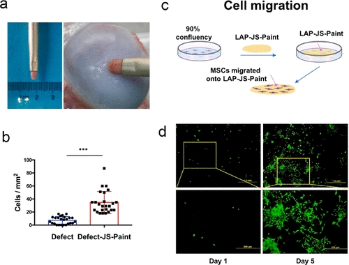 細(xì)胞接種后 1 天,許多細(xì)胞均勻分布在 LAP-JS-Paint 表面上(圖 4a)。LAP-JS-Paint 表面也顯示出生物相容性和無(wú)毒性。在體外部分厚度缺陷模型中用JS-Paint(Defect-JS-Paint)進(jìn)一步評(píng)估了軟骨缺損(Defect)和軟骨缺損處的細(xì)胞附著特性。結(jié)果表明軟骨表面的JS-Paint可以大大改善細(xì)胞附著(圖5b),且具有良好的細(xì)胞遷移特性(圖5d)。