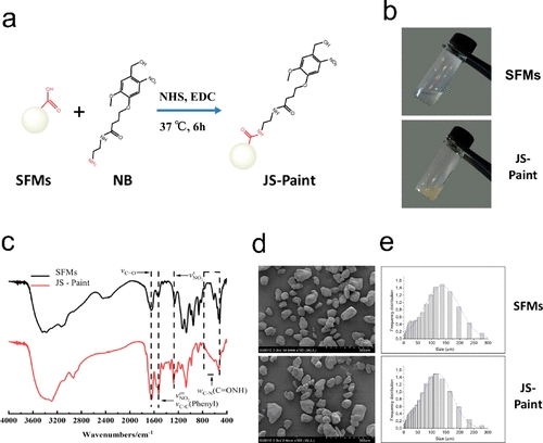 使用NB修飾的絲素蛋白微粒(SFMs)制備了組織粘附劑JS-Paint。傅立葉變換紅外光譜證實(shí),NB已成功接枝在SFM上。SFM和JS-Paint的平均直徑為100-150 μm。