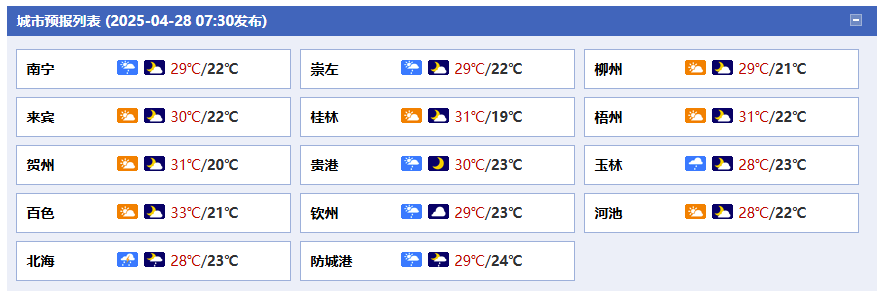 南寧市:今天白天陣雨、局地中到大雨,今天晚上,多云,東北風(fēng)2級,最高氣溫29℃,最低氣溫22℃。