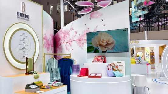 本屆消博會,凱喜雅展現(xiàn)了旗下絲綢產(chǎn)品的創(chuàng)新性與多樣性。從“可機洗”真絲、“防曬”真絲、“三防”真絲等功能性絲綢,到真絲包、真絲香囊等文創(chuàng)產(chǎn)品,可謂是“亂花漸欲迷人眼”!