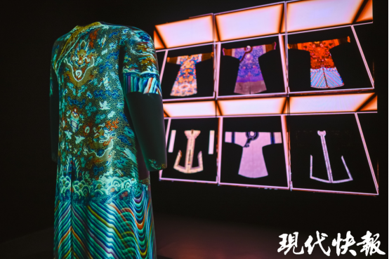 “袞”(ɡǔn),指古代帝王或三公穿的禮服,是帝王高規(guī)格的禮服,尤其是天子祭祀時所穿的有龍紋的禮服。本次展館中的“袞”主角——“石青緙五彩四團(tuán)云龍袞織成”的袍料誕生于清代蘇州織造署,當(dāng)時這些御用織物曾沿大運(yùn)河北上紫禁城,一路經(jīng)過的倉街、平江、山塘三大歷史街區(qū)都是明清以來蘇州的繁華之地,更是康熙、乾隆下江南的探訪之地。展覽通過多元數(shù)字化的美學(xué)表達(dá),AI、AR、VR、3Dmapping、沉浸式三維投影、硅基視網(wǎng)膜等技術(shù),帶領(lǐng)觀眾探索緙絲、宮廷禮服以及蘇州古城的故事。