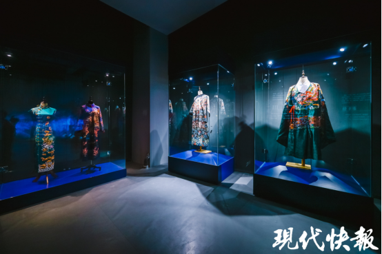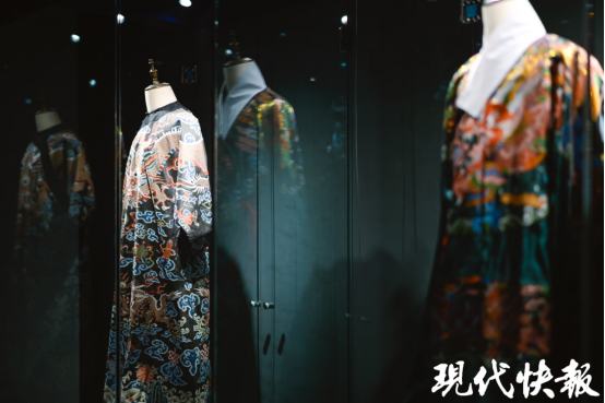 對于這件“石青緙五彩四團(tuán)云龍袞織成”,蘇州緙絲織造技藝代表性傳承人陳文及團(tuán)隊就染色、經(jīng)緯密、緙織結(jié)構(gòu)等工藝技術(shù)進(jìn)行了細(xì)致研究,歷經(jīng)一年多時間完成了服飾仿制。35天定色與造機(jī),335天研究與緙織,實現(xiàn)了當(dāng)代非遺傳承人與清代織造跨越百年的對話。隨主展品一起展出的,還有姚惠芬、府向紅、王建江、馮英、吳齊等眾多非遺傳承人的服飾作品,包括緙絲龍袍、妝花紗蟒袍、蘇繡旗袍等,它們在經(jīng)緯交織間重現(xiàn)皇家氣象,以針?biāo)鬄楣P織就江南絲綢文化。