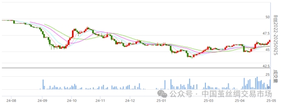 今日(2025年04月30日,周三)中國繭絲綢交易市場生絲電子指數(shù)上漲0.28%報收于4650.01點,本月生絲指數(shù)累計上漲1.00%。B絲2022D(商檢4A級生絲):250525合約上漲0.15萬元報收于46.41萬元;250925合約上漲0.27萬元報收于46.77萬元;260325合約上漲0.09萬元報收于46.50萬元。