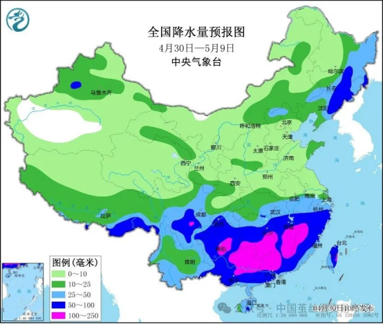 未來10天(4月30日-5月9日),江南南部、華南及四川、貴州、東北地區(qū)東部累計降水量較常年同期偏多2~6成,局地偏多1倍以上,我國其他大部地區(qū)降水偏少。