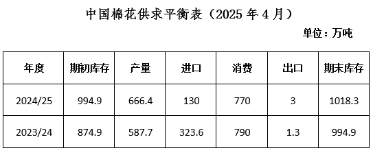美國(guó)“對(duì)等關(guān)稅”政策嚴(yán)重?fù)p害國(guó)際貿(mào)易秩序,我國(guó)紡織品服裝出口受到?jīng)_擊,預(yù)計(jì)對(duì)我國(guó)棉花消費(fèi)量和進(jìn)口量將造成一定影響。中國(guó)棉花協(xié)會(huì)預(yù)計(jì)2024/25年度全國(guó)棉花消費(fèi)量為770萬(wàn)噸,較上期下調(diào)24萬(wàn)噸,同比下降2.5%;進(jìn)口量130萬(wàn)噸,較上期下調(diào)10萬(wàn)噸,同比下降59.8%;產(chǎn)量為666.4萬(wàn)噸,同比增長(zhǎng)13.4%;期末庫(kù)存相應(yīng)上調(diào)為1018.3萬(wàn)噸,同比增長(zhǎng)2.4%。