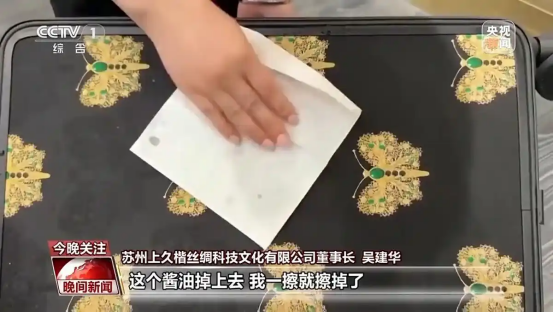 蘇州上久楷絲綢科技文化有限公司董事長 吳建華:這個宋錦面料,經(jīng)過一些特殊的三防處理,就是防水、防油污、防火。三防處理以后,礦泉水倒上去,醬油倒上去,一擦就擦掉了。