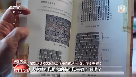 宋錦織造技藝國家級代表性傳承人 錢小萍:我把我這個知識很正確地記錄在我的書上《中國宋錦》,那么就可以傳播了,人家就可以照我的書去做了,開源了。在電腦織機上一做,全國遍地開花。