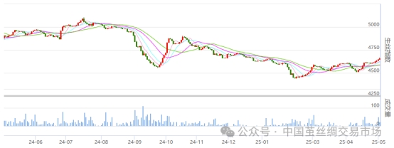 今日(2025年05月06日,周二)中國繭絲綢交易市場生絲電子指數(shù)上漲0.22%報收于4660.17點。B絲2022D(商檢4A級生絲):250525合約上漲0.12萬元報收于46.53萬元;250925合約上漲0.18萬元報收于46.95萬元;260325合約上漲0.15萬元報收于46.65萬元。