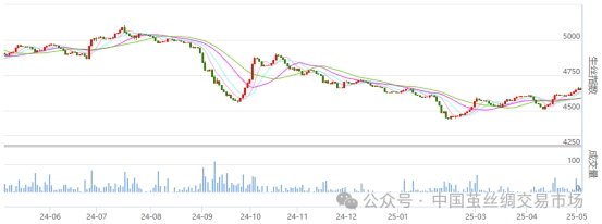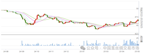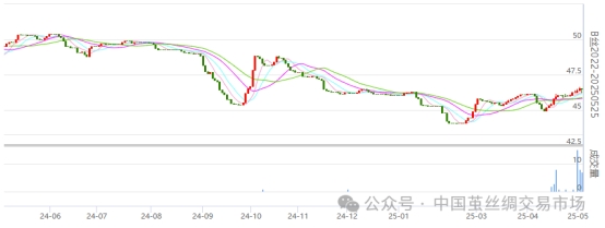 今日(周三)盤面各遠近合約價格有所窄幅調整,持倉量略有下降。主力250925生絲合約在47萬整數(shù)關口有阻力。