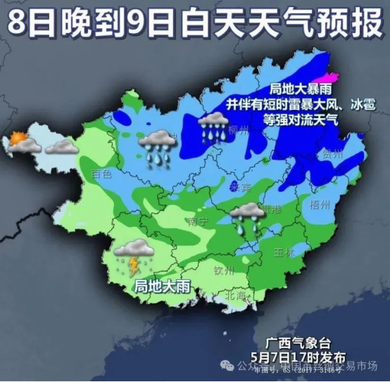 天氣上,5月8日10時,廣西氣象臺發(fā)布暴雨藍色預警,預計: