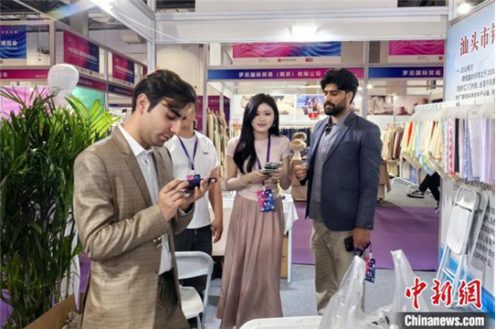 5月7日,2025中國(guó)(南昌)國(guó)際服裝服飾博覽會(huì)上,境外采購(gòu)商在現(xiàn)場(chǎng)咨詢