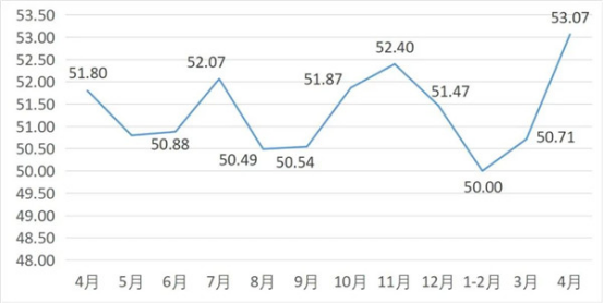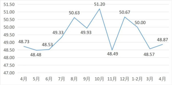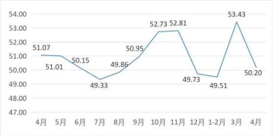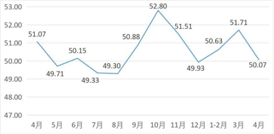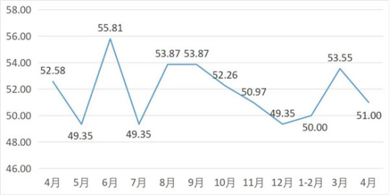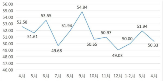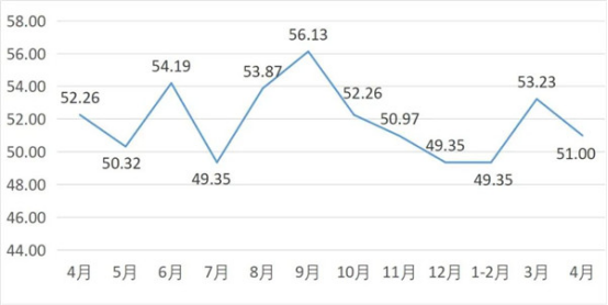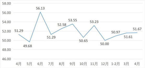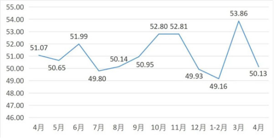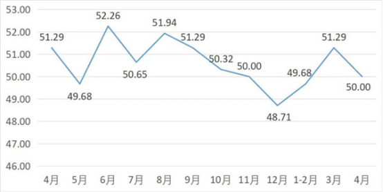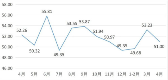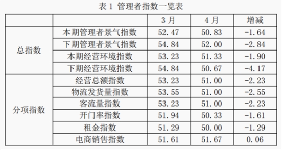 從管理者景氣指數(shù)來看,總指數(shù)中,4月管理者景氣指數(shù)為50.83,較上期下降1.64個百分點(diǎn);經(jīng)營環(huán)境指數(shù)為51.33,較上期下降1.90個百分點(diǎn)。