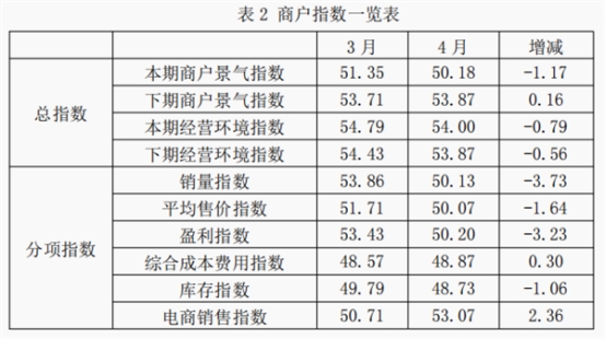 從商戶景氣指數(shù)來看,總指數(shù)中,4月商戶景氣指數(shù)為50.18, 較上期下降1.17個百分點(diǎn);經(jīng)營環(huán)境指數(shù)為54.00, 較上期下降0.79個百分點(diǎn)。